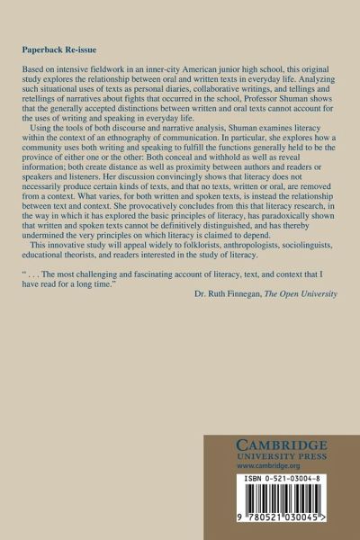 Based on intensive fieldwork in an urban American junior high school, this original study explores the relationship between oral and written texts in everyday life by analysing tellings and retellings of local events, diaries, writings and discussions.
