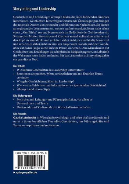 Geschichten und Erzählungen erzeugen Bilder, die einen bleibenden Eindruck hinterlassen. Geschichten hinterfragen festsitzende Überzeugungen, bringen das rationale Denken durcheinander und führen zum Nachdenken. Sie dienen als ergänzendes Lehrinstrument, wecken Aufmerksamkeit, lösen nicht selten einen "Aha-Effekt" aus und brennen sich im Gedächtnis der Zuhörenden ein. Sie sprechen Muster, Stereotype und Klischees an und stellen diese mitunter auf den Kopf; sie sind direkt und verletzen dabei nicht; sie sind häufig bewertend und verurteilen dabei nicht; sie sind der Finger oder das Salz auf einer Wunde, ohne dabei den Finger direkt auf eine Person zu richten. Dem Menschen ist mit Geschichten und Erzählungen die schöpferische Fähigkeit gegeben, im Labyrinth der Welt einen roten Faden zu finden. Für das Leadership ist Storytelling daher ein grandioses Tool.