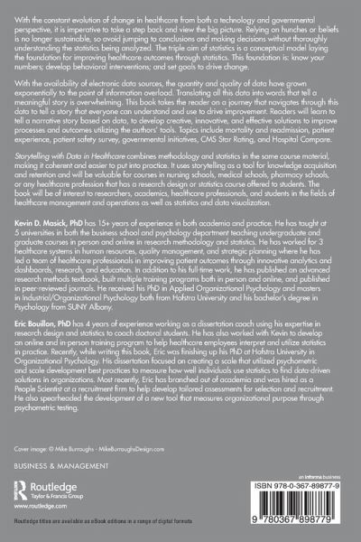 Storytelling with Data in Healthcare combines methodology and statistics in the same course material, making it coherent and easier to put into practice. It uses storytelling as a tool for knowledge acquisition and retention and will be valuable for courses in nursing schools, medical schools, pharmacy schools or any healthcare profession that has a research design or statistics course offered to students. The book will be of interest to researchers, academics, healthcare professionals, and students in the fields of healthcare management and operations as well as statistics and data visualization.