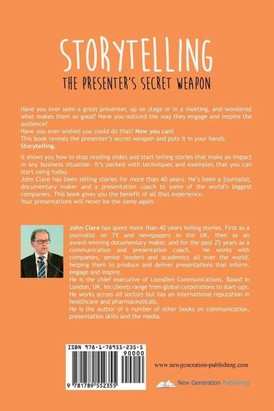 Have you ever seen a great presenter, up on stage or in a meeting, and wondered what makes them so good? Have you noticed the way they engage and inspire the audience? Have you ever wished you could do that? Now you can! This book reveals the presenter's secret weapon and puts it in your hands: Storytelling. It shows you how to stop reading slides and start telling stories that make an impact in any business situation. It's packed with techniques and examples that you can start using today. John Clare has been telling stories for more than 40 years. He's been a journalist, documentary maker and a presentation coach to some of the world's biggest companies. This book gives you the benefit of all that experience. Your presentations will never be the same again.