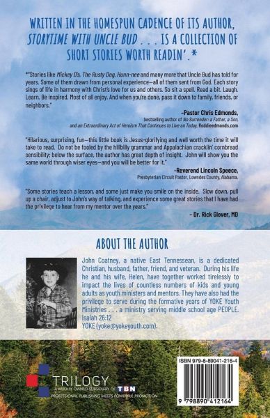WRITTEN IN THE HOMESPUN CADENCE OF ITS AUTHOR, STORYTIME WITH UNCLE BUD...IS A COLLECTION OF SHORT STORIES WORTH READIN'.* *"Stires like Mickey D's, The Rusty Dog, Hunn-nee and many more that Uncle Bud has told for years. Some of them drawn from personal experience - all of them sent from God. Each story sings of life harmony with Christ's love for us and others. So sit a spell. Read a bit. Laugh. Learn. Be inspired. Most of all enjoy. And when you're done, pass it down to family, friends, or neighbors." Pastor Chris Edmonds, Bestselling author of No Surrender: a Father, a Son and an Extraordinary Act of Heroism That Continues to Live on Today, Roddieedmonds.com "Hilarious, surprising, fun - this little book is Jesus-glorifying and well worth the time it will take to read. Do not be fooled by the hillbilly grammar and Appalachian cracklin' cornbread sensibility; below the surface, the author has great depth of insight. John will show you the same world through wiser eyes - and you will be better for it." Reverend Lincoln Speece, Presbyterian Circuit Pastor, Lowndes County, Alabama "Some stories teach a lesson, and some just make you smile on the inside. Slow down, pull up a chair, adjust to John's way of talking, and experience some great stories that I have had the privilege to hear from my mentor over the years." Dr. Rick Glover, MD