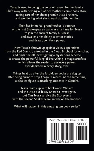 Tessa is used to being the voice of reason for her family. She's okay with helping out at her mother's comic book store, taking care of her chaos gremlin little brothers, and wondering what she should do with her life. Then her immortal grandmother-a veteran of the first Shakespearan war-says it's time for Tessa to join the ancient family business and awakens her ability to enter stories and draw upon their power. Now Tessa's thrown up against vicious operatives from the Red Council, enrolled in the Cloud 9 school for witches, and finds herself investigating a mysterious scheme to create the powerful Ring of Everything-a magic artefact which allows the reader to use every power ever depicted in every story, ever. Things heat up after the forbidden books are dug up after being burnt to stop Abagail's return. At the same time, a cloaked figure is attacking students in Cloud 9. Tessa teams up with bookworm William and the little but feisty Snow to investigate, but Can Tessa survive the Storyverse with the second Shakespeareian war on the horizon? What will happen in this amazing ten book series?