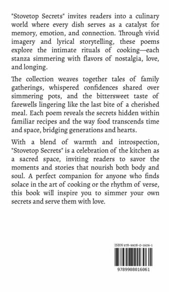 "Stovetop Secrets" invites readers into a culinary world where every dish serves as a catalyst for memory, emotion, and connection. Through vivid imagery and lyrical storytelling, these poems explore the intimate rituals of cooking-each stanza simmering with flavors of nostalgia, love, and longing. The collection weaves together tales of family gatherings, whispered confidences shared over simmering pots, and the bittersweet taste of farewells lingering like the last bite of a cherished meal. Each poem reveals the secrets hidden within familiar recipes and the way food transcends time and space, bridging generations and hearts. With a blend of warmth and introspection, "Stovetop Secrets" is a celebration of the kitchen as a sacred space, inviting readers to savor the moments and stories that nourish both body and soul. A perfect companion for anyone who finds solace in the art of cooking or the rhythm of verse, this book will inspire you to simmer your own secrets and serve them with love.