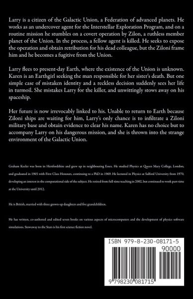 Graham Keeler was born in Hertfordshire and grew up in neighbouring Essex. He studied Physics at Queen Mary College, London, and graduated in 1965 with First Class Honours, continuing to a PhD in 1969. He lectured in Physics at Salford University from 1970, developing an interest in the computational side of the subject. He retired from full-time teaching in 2002, but continued to work part-time at the University until 2012. He is British, married with three grown-up daughters and five grandchildren. His interests include badminton and tennis, which he still plays on a regular basis, representing local clubs in league matches. He also enjoys playing bridge, and flying. He has a private pilot's licence and has toured in the UK and abroad, making his longest journey in 2002, to Marrakesh. He is fascinated by anything to do with astrophysics and space travel, and applied to be a British candidate for the first American Spacelab mission. He has written, co-authored and edited seven books on various aspects of microcomputers and the development of physics software simulations. Stowaway to the Stars is his first science fiction novel.