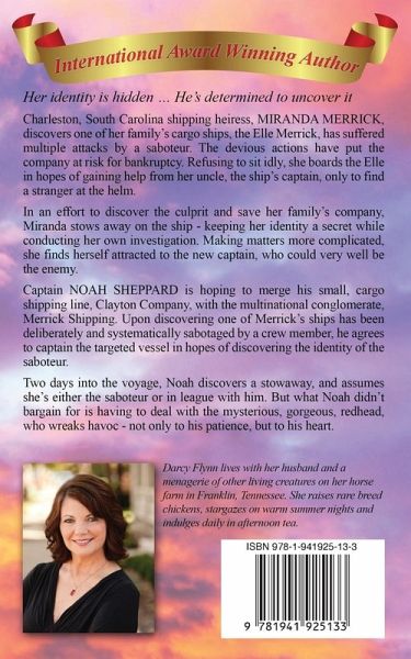 Her identity is hidden … He’s determined to uncover it Charleston, South Carolina shipping heiress, MIRANDA MERRICK, discovers one of her family’s cargo ships, the Elle Merrick, has suffered multiple attacks by a saboteur. The devious actions have put the company at risk for bankruptcy. Miranda refuses to sit idly and wait for years of hard work to be destroyed. She boards the Elle in hopes of gaining help from her uncle, the ship’s captain, only to discover a stranger at the helm. A man much younger than her uncle, and someone she believes has no business being there. In an effort to discover the culprit and save her family’s company, Miranda stows away on the ship - keeping her identity a secret while conducting her own investigation. Making matters more complicated, she finds herself attracted to the new captain, who could very well be the enemy. After all, until she can uncover the truth, everyoneis suspect. Captain NOAH SHEPPARD is hoping to merge his small, cargo shipping line, Clayton Company, with the multinational conglomerate, Merrick Shipping. Upon discovering one of Merrick’s ships has been deliberately and systematically sabotaged by a crew member, he agrees to captain the targeted vessel in hopes of discovering the identity of the saboteur. Once caught and brought to justice, both companies will then be able to close the deal and complete the merger. Two days into the voyage, Noah discovers a stowaway, and assumes she’s either the saboteur or in league with him. But what Noah didn’t bargain for is having to deal with the mysterious, gorgeous, redhead, who wreaks havoc - not only to his patience, but to his heart.
