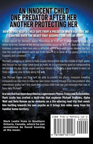 HOW DO YOU KEEP AN INNOCENT CHILD SAFE FROM A PREDATOR WHEN YOU HAVE NO CONTROL OVER THE BEAST THAT ASSUMES CONTROL OF YOU? A train bound for Vermont leaves Manhattan at 11:35 AM. It takes approximately 9 hours to arrive. Sunset at the arrival destination occurs at 8:20 PM. How does Michael Andrews, a man on that train who is afflicted with a werewolf curse, resolve the fact that the math just doesn't work out in his favor? Or in favor of the young girl who is trapped, and cornered? Michael's unequivocal desire to help usually thrusts him into the middle of tight spots. And though he has never been good at math, he is consistently good at compounding the peril in his day. On an urgent and last minute trip to help a dear friend in need, he finds someone else to help along the way. Can Michael figure out how he'll be able to protect his young, innocent traveling companion as she tries to make her own cross-country escape from the predator who relentlessly stalks her? And does this curious child hold her own answers that can, in turn, help Michael? In a tale that has been described as Logan meets Planes, Trains and Automobiles, Mark Leslie has crafted a thrill-ride that explores Michael Andrews, Alpha Wolf and Beta Human as he embarks on a life-altering road trip that sends him hurtling towards his own psyche as it brings him miles away from his familiar home territory.