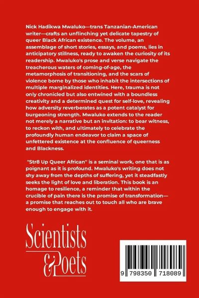 Str8 Up Queer African, by the trans Tanzanian-American author Nick Hadikwa Mwaluko, is a poignant exploration of the queer Black African experience, told with unguarded emotion and an unyielding tenderness. Mwaluko weaves a powerful narrative through essays, stories, and poems that confront the harsh realities of trauma, transitioning, and societal exclusion, yet triumphs in capturing the immense creativity and resilience of those living at the crossroads of multiple marginalized identities. This collection resonates as a testament to the human struggle and the relentless pursuit of self-love and liberation, offering readers a profound opportunity to engage with stories of pain transfigured into power and identity celebrated in its most authentic form
