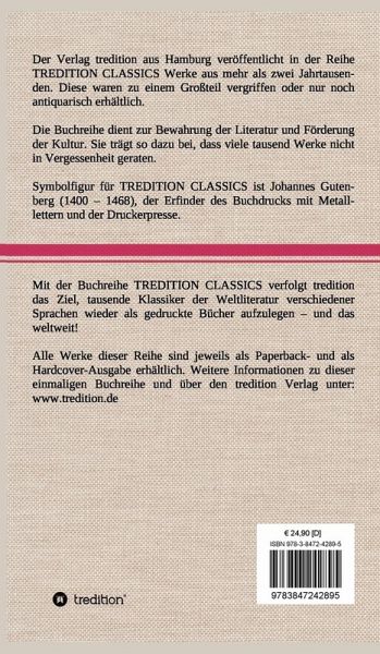 Diese Hardcover-Ausgabe ist Teil der TREDITION CLASSICS. Der Verlag tredition aus Hamburg veröffentlicht in der Buchreihe TREDITION CLASSICS Werke aus mehr als zwei Jahrtausenden. Diese waren zu einem Großteil vergriffen oder nur noch antiquarisch erhältlich. Mit TREDITION CLASSICS verfolgt tredition das Ziel, tausende Klassiker der Weltliteratur verschiedener Sprachen wieder als gedruckte Bücher zu verlegen und das weltweit! Die Buchreihe dient zur Bewahrung der Literatur und Förderung der Kultur. Sie trägt so dazu bei, dass viele tausend Werke nicht in Vergessenheit geraten.