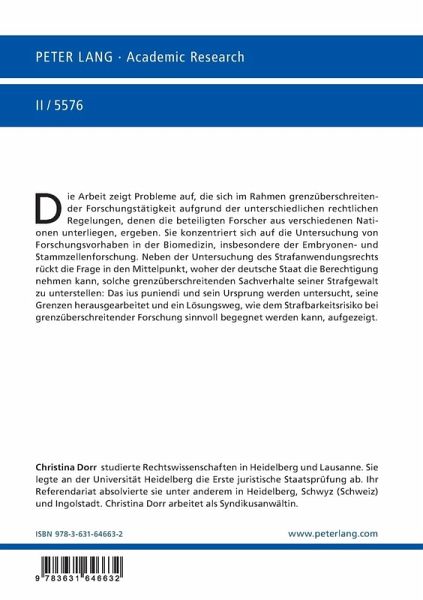 Die Arbeit zeigt Probleme auf, die sich im Rahmen grenzüberschreitender Forschungstätigkeit aufgrund der unterschiedlichen rechtlichen Regelungen, denen die beteiligten Forscher aus verschiedenen Nationen unterliegen, ergeben. Sie konzentriert sich auf die Untersuchung von Forschungsvorhaben in der Biomedizin, insbesondere der Embryonen- und Stammzellenforschung. Neben der Untersuchung des Strafanwendungsrechts rückt die Frage in den Mittelpunkt, woher der deutsche Staat die Berechtigung nehmen kann, solche grenzüberschreitenden Sachverhalte seiner Strafgewalt zu unterstellen: Das ius puniendi und sein Ursprung werden untersucht, seine Grenzen herausgearbeitet und ein Lösungsweg, wie dem Strafbarkeitsrisiko bei grenzüberschreitender Forschung sinnvoll begegnet werden kann, aufgezeigt