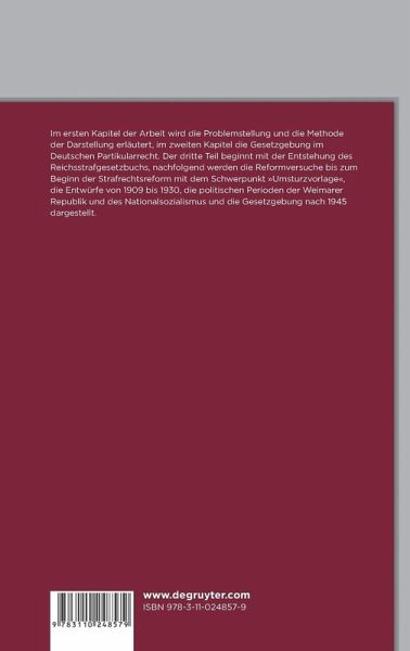In the first chapter of this work, the central issue and the method of presentation are explained. The second chapter describes the legislation of the German particular law (Partikularrecht). The third chapter begins with the development of the Reich Criminal Law Code and is followed by presentations of the reform attempts up to the start of the criminal law reform focused on the "revolution bill"; the drafts from 1909 to 1930, the political periods of the Weimar Republic and of National Socialism, and post-1945 legislation are also addressed.