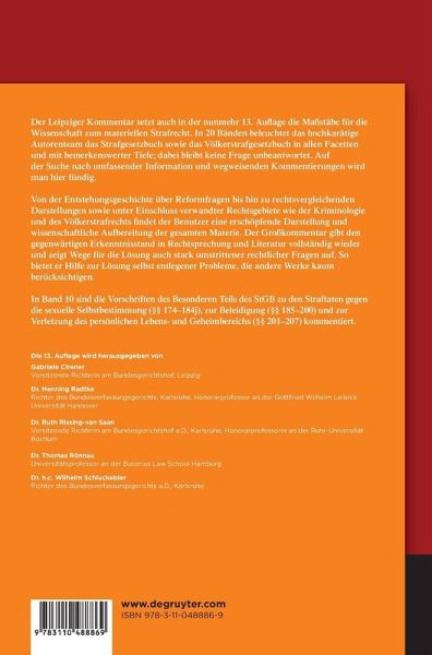 In Band 10 sind die Vorschriften des Besonderen Teils des StGB zu den Straftaten gegen die sexuelle Selbstbestimmung (§§ 174- 184j), zur Beleidigung (§§ 185-200) und zur Verletzung des persönlichen Lebens- und Geheimbereichs (§§ 201-207) kommentiert.