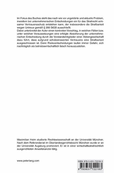 Im Fokus des Buches steht das nach wie vor ungeklärte und aktuelle Problem, inwiefern bei unternehmerischen Entscheidungen ein für das Strafrecht wirksamer Vertrauensschutz entstehen kann, der insbesondere die Strafbarkeit wegen Untreue gemäß § 266 StGB ausschließt.