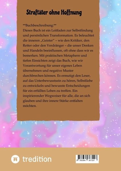 Dieses Buch ist ein Leitfaden zur Selbstfindung und persönlichen Transformation. Es beleuchtet die inneren "Geister" - wie den Kritiker, den Retter oder den Verdränger - die unser Denken und Handeln beeinflussen, oft ohne dass wir es bemerken. Mit praktischen Metaphern und tiefen Einsichten zeigt das Buch, wie wir Verantwortung für unser eigenes Leben übernehmen und negative Muster durchbrechen können. Es ermutigt den Leser, auf das Unterbewusstsein zu hören, Selbstliebe zu entwickeln und bewusste Entscheidungen für ein erfülltes Leben zu treffen. Ein inspirierender Wegweiser für alle, die an sich glauben und ihre innere Stärke entfalten möchten.