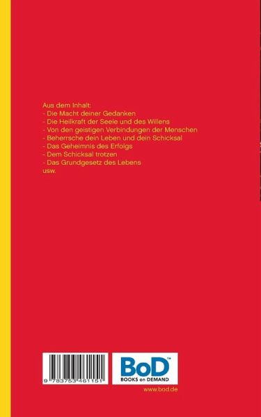 Aus dem Inhalt:- Die Macht deiner Gedanken- Die Heilkraft der Seele und des Willens- Von den geistigen Verbindungen der Menschen- Beherrsche dein Leben und dein Schicksal- Das Geheimnis des Erfolgs- Dem Schicksal trotzen- Das Grundgesetz des Lebensusw.