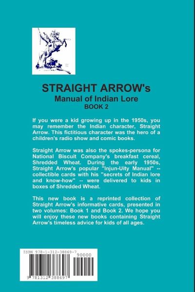 STRAIGHT ARROW's Manual of Indian Lore, Book 2: If you were a kid growing up in the 1950s, you may remember the Indian character, Straight Arrow. This fictitious character was the hero of a children's radio show and comic books. Straight Arrow was also the spokes-persona for National Biscuit Company's breakfast cereal, Shredded Wheat. During the early 1950s, Straight Arrow's popular "Injun-Uity Manual" --collectible cards with his "secrets of Indian lore and know-how" -- were delivered to kids in boxes of Shredded Wheat. This new book is a reprinted collection of Straight Arrow's informative cards, presented in two volumes: Book 1 and Book 2. We hope you will enjoy these new books containing Straight Arrow's timeless advice for kids of all ages.