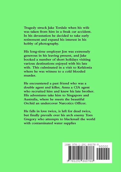 Tragedy struck Jake Tordale when his wife was taken from him in a freak car accident. In his devastation he decided to take early retirement and expand his interest in his hobby of photography. His long-time employer Jon was extremely generous in his leaving present, and Jake booked a number of short holidays visiting various destinations enjoyed with his late wife. This culminated in a visit to Kefalonia where he was witness to a cold blooded murder. He encountered a past friend who was a double agent and killer, Anna a CIA agent who recruited him and knew his late brother. His adventures take him to Singapore and Australia, where he meets the beautiful Orchid an undercover Narcotics Officer. He falls in love twice, is left for dead twice, but finally prevails over his arch enemy Tom Gregory who attempts to blackmail the world with contaminated water supplies