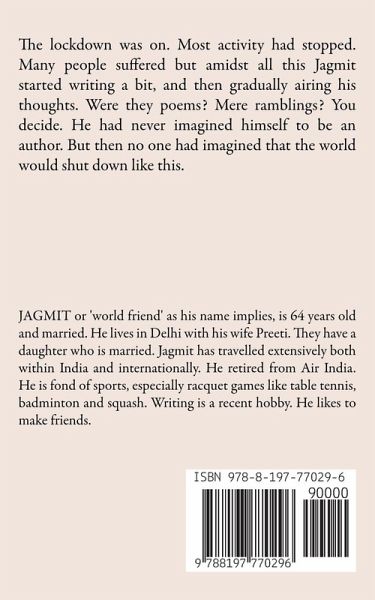 The lockdown was on. Most activity had stopped. Many people suffered but amidst all this Jagmit started writing a bit, and then gradually airing his thoughts. Were they poems? Mere ramblings? You decide. He had never imagined himself to be an author. But then no one had imagined that the world would shut down like this.
