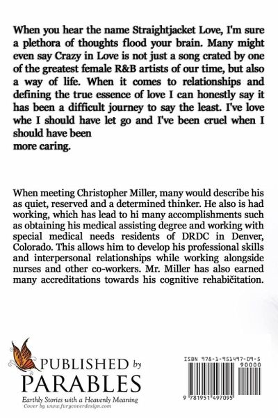 When you hear the name Straightjacket Love, I'm sure a plethora of thoughts flood your brain. Many might even say Crazy in Love is not just a song crated by one of the greatest female R&B artists of our time, but also a way of life. When it comes to relationships and defining the true essence of love I can honestly say it has been a difficult journey to say the least. I've love whe I should have let go and I've been cruel when I should have been more caring. When meeting Christopher Miller, many would describe his as quiet, reserved and a determined thinker. He also is had working, which has lead to hi many accomplishments such as obtaining his medical assisting degree and working with special medical needs residents of DRDC in Denver, Colorado. This allows him to develop his professional skills and interpersonal relationships while working alongside nurses and other co-workers. Mr. Miller has also earned many accreditations towards his cognitive rehabi¿itation. He is looking forward to the continued impact he longs to give to the world.