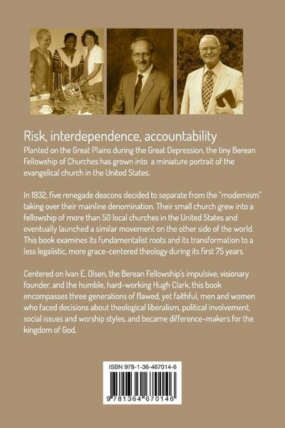Planted on the Great Plains during the Great Depression, the tiny Berean Fellowship of Churches has grown into a miniature portrait of the evangelical church in the United States. In 1932, five renegade deacons decided to separate from the "modernism" taking over their mainline denomination. Their small church grew into a fellowship of more than 50 local churches in the United States and eventually launched a similar movement on the other side of the world. This book examines its fundamentalist roots and its transformation to a less legalistic, more grace-centered theology during its first 75 years. Centered on Ivan E. Olsen, the Berean Fellowship's impulsive, visionary founder, and the humble, hard-working Hugh Clark, this book encompasses three generations of flawed, yet faithful, men and women who faced decisions about theological liberalism, political involvement, social issues and worship styles, and became difference-makers for the kingdom of God.
