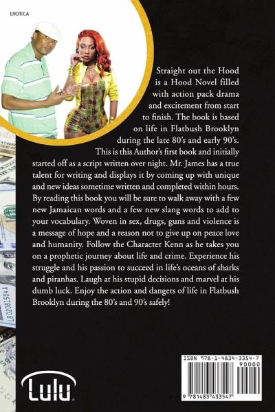 Straight out the Hood is a Hood Novel filled with action pack drama and excitement from start to finish. The book is based on life in Flatbush Brooklyn during the late 80's and early 90's. This is this Author's first book and initially started off as a script written over night. Mr. James has a true talent for writing and displays it by coming up with unique and new ideas sometime written and completed within hours. By reading this book you will be sure to walk away with a few new Jamaican words and a few new slang words to add to your vocabulary. Woven in sex, drugs, guns and violence is a message of hope and a reason not to give up on peace love and humanity. Follow the Character Kenn as he takes you on a prophetic journey about life and crime. Experience his struggle and his passion to succeed in life's oceans of sharks and piranhas. Laugh at his stupid decisions and marvel at his dumb luck. Enjoy the action and dangers of life in Flatbush Brooklyn during the 80's and 90's safely!