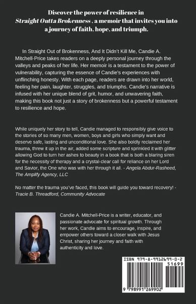 In Straight Out of Brokenness, And It Didn't Kill Me, Candie A. Mitchell-Price takes readers on a deeply personal journey through the valleys and peaks of her life. This memoir is a testament to the power of vulnerability, capturing the essence of Candie's experiences with unflinching honesty. With each page, readers are drawn into her world, feeling her pain, laughter, struggles, and triumphs. Candie's narrative is infused with her unique blend of grit, humor, and unwavering faith, making this book not just a story of brokenness but a powerful testament to resilience and hope. The memoir explores Candie's raw and real experiences, inviting readers to reflect on their own lives while journeying alongside her. From moments of despair to breakthroughs of joy, Straight Out of Brokenness is a masterful blend of transparency and inspiration. Candie does not shy away from sharing her deepest pains, but she also ensures that readers leave with a sense of hope and victory. Her story will make you laugh, cry, and ponder the deeper aspects of life, faith, and personal growth.
