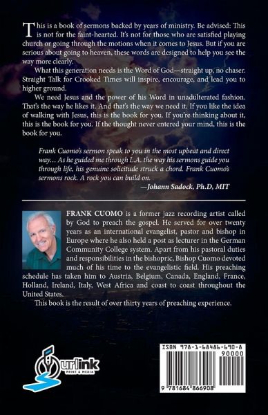 This is a book of sermons backed by years of ministry. Be advised: This is not for the faint-hearted. It's not for those who are satisfied playing church or going through the motions when it comes to Jesus. But if you are serious about going to heaven, these words are designed to help you see the way more clearly. What this generation needs is the Word of God-straight up, no chaser. Straight Talk for Crooked Times will inspire, encourage, and lead you to higher ground. We need Jesus and the power of his Word in unadulterated fashion. That's the way he likes it. And that's the way we need it. If you like the idea of walking with Jesus, this is the book for you. If you're thinking about it, this is the book for you. If the thought never entered your mind, this is the book for you. Frank Cuomo's sermon speak to you in the most upbeat and directway... As he guided me through L.A. the way his sermons guide youthrough life, his genuine solicitude struck a chord. Frank Cuomo'ssermons rock. A rock you can build on.-Johann Sadock, Ph.D, MIT