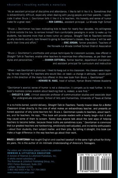As Mr. Gevirtzman's final high school principal in his extensive teaching career, I can vouch that Gevirtzman still has the pep, energy, and enthusiasm of a 25-year-old. It is this same zeal that seems to transcend throughout his classroom to his students. -- Don Jones, La Mirada High School Principal Gevirtzman's acerbic sense of humor is not a distraction; it compels us to reader further. In this book's madness comes wisdom about teaching that is, indeed, a rare find. -- Shelley D. Lane, Clinical Associate Professor of Communication Studies and Associate Dean for Undergraduate Education, School of Arts and Humanit When I was Gevirtzman's principal for seven years, I liked to hang out in his classroom. His classes were inspiring; he was inspiring! For teachers who would like-or need-a change in attitude, I would point you in the direction of the many tips offered in this new book from Bruce Gevirtzman! -- Howard M. Haas, Head of School, Hyman Brand Hebrew Academy For the past 38 years, Bruce Gevirtzman, a wildly successful high school English teacher, has cared about his students, challenged them, and made them think about the big issues in life. His unorthodox and unique techniques for classroom success, now offered in Straight Talk to Teachers, enable other teachers to maximize their effectiveness, as per their own styles and personalities. -- Sharon Cotterell, former teacher, department chairperson, and assistant principal for curriculum and instruction Bruce Gevirtzman has been motivating kids to learn for nearly four decades. His Willingness to think outside the box, to remove himself from comfortable paradigms in order to wake up his students, has become more than a mere rumor on campus. Straight Talk for Teachers reminds us why students actually look forward to going to Gevirtzman's classes: they know it will be well worth their time and effort. -- Eric Jordan, former president, Teachers of the Norwalk-La Mirada Unified School District Association Mr. Gevirtzman is one of the main reasons I became a teacher. When a student of his, I admired his integrity, laughed at his sense of humor, and learned from his wisdom. During the years I taught school, I had already applied several of the "insane" ideas discussed in his new book. -- Nermin Kamel, Assistant Principal, Redondo Union High School, and Vice President, California High School Speech Association As an assistant principal of discipline and attendance, I like to tell it like it is. Sometimes that is extraordinarily difficult, especially when dealing with young people and their parents. I appreciate it when Gevirtzman tells it like it is to teachers. His honesty and sense of humor make for a great read. -- Ron Carroll, Assistant Principal, La Mirada High School