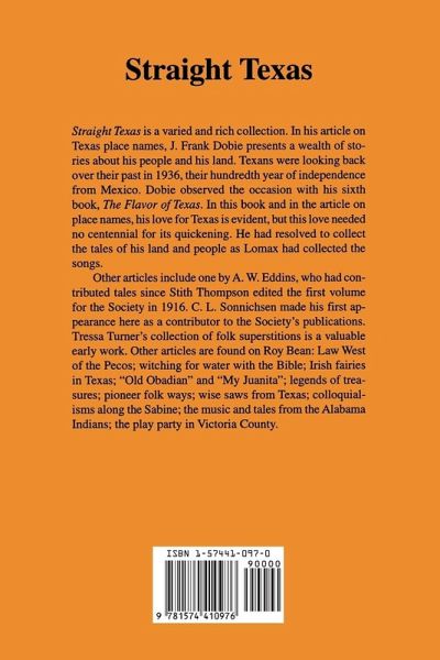 A Publication of the Texas Folklore Society. The topics include Texas place names, Roy Bean, anecdotes from Brazos River bottoms, Mexican ghosts from El Paso, comedy in folk superstitions, witching for water with the Bible, pioneer folk ways, old sayings from Texas, Irish fairies in Texas, Alabama Indian music, and tales from the Alabamas.