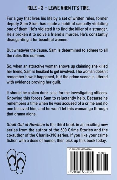 Rule #3 - Leave when it's time. For a guy that lives his life by a set of written rules, former deputy Sam Strait has made a habit of casually violating one of them. He's violated it to find the killer of a stranger. He's broken it to solve a friend's murder. He's constantly disregarding it for beautiful women. But whatever the cause, Sam is determined to adhere to all the rules this summer. So, when an attractive woman shows up claiming she killed her friend, Sam is hesitant to get involved. The woman doesn't remember how it happened, but the crime scene is littered with evidence proving her guilt. It should be a slam dunk case for the investigating officers. Knowing this forces Sam to reluctantly help. Because he remembers a time when he was accused of a crime and no one believed him, and he won't let this woman go through that drama alone. Strait Out of Nowhere is the third book in an exciting new series from the author of the 509 Crime Stories and the co-author of the Charlie-316 series. If you like your crime fiction with a dose of humor, then pick up this book today.
