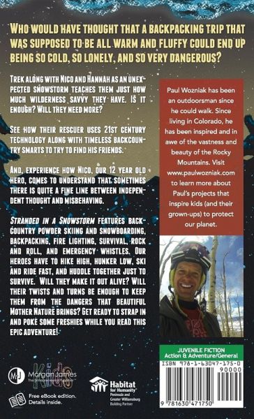 "Stranded in a Snowstorm" is a thrilling extreme sports, action adventure chapter book for kids 7-12 that teaches lessons of green living and survival. It takes the reader through a harrowing backpacking trip that puts 12 year old Nico, his baby sitter and friend Hannah, and their mountaineering rescuer Paul to the test as an unexpected snowstorm strands them in the middle of the woods in Colorado's Rocky Mountains. While they are stuck out there in the wilderness, they learn important things about survival, their surroundings, themselves and the Earth they inhabit. The story highlights how lucky we are to have water flow freely through our faucets at home, the unexpected merits of misbehaving, how important attitude is in survival (and otherwise), and how the greatest tool we have at our disposal is our mind.