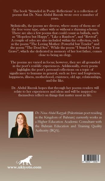 The book 'Stranded in Poetic Reflections' is a collection of poems that Dr. Nina Abdul Razzak wrote over a number of years. Stylistically, the poems are diverse, where many of them are of the free verse type, either with or without a rhyming scheme. There are also a few poems that could count as ballads, such as "Hopeless but Happy", "Like a Rainbow", and "Revival". A couple of odes are also included within the collection, such as the poem "The Loving Mother: Powerful but Tender" and the poem "The Dead Sea". While the poem "I Stand by Your Grave", which she dedicated in memory of her lost father, comes close to being an elegy. The poems are varied in focus; however, they are all grounded in the poet's real-life experiences. Additionally, every poem highlights the poet's personal reflections on a topic of significance to humans in general, such as: love and forgiveness, happiness, illness, motherhood, existence, old age, relationships, and the like. Dr. Abdul Razzak hopes that through her poems readers will relate to her experiences and ideas and will be inspired to themselves reflect on things that matter most in life.