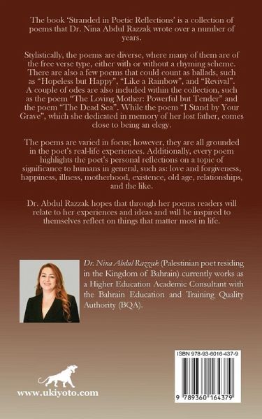 The book 'Stranded in Poetic Reflections' is a collection of poems that Dr. Nina Abdul Razzak wrote over a number of years. Stylistically, the poems are diverse, where many of them are of the free verse type, either with or without a rhyming scheme. There are also a few poems that could count as ballads, such as "Hopeless but Happy", "Like a Rainbow", and "Revival". A couple of odes are also included within the collection, such as the poem "The Loving Mother: Powerful but Tender" and the poem "The Dead Sea". While the poem "I Stand by Your Grave", which she dedicated in memory of her lost father, comes close to being an elegy. The poems are varied in focus; however, they are all grounded in the poet's real-life experiences. Additionally, every poem highlights the poet's personal reflections on a topic of significance to humans in general, such as: love and forgiveness, happiness, illness, motherhood, existence, old age, relationships, and the like. Dr. Abdul Razzak hopes that through her poems readers will relate to her experiences and ideas and will be inspired to themselves reflect on things that matter most in life.