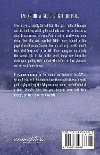 Ending the world just got too real. After Anaya is forcibly Shifted from the spirit realm of Lemayle and into the living world by her soulmate and rival, Jordin, she is about to experience the divine Plan to end the world -- now much closer than she ever expected. While being trapped in the physical world means Kade can hear her instantly, he still doesn't trust what Anaya can't prove. With time running out and a body that wasn't built to live in this world, Anaya now faces the challenge of guiding Kade to his destiny before her form gives out and her soul fades forever. In Stranded, the second installment of the Shifted series, KristaLyn A. Vetovich explores the complications of a spirit guide trying to keep the living world on course, one individual at a time. Stranded dives into what happens when faith isn't enough, but trust is all you have left.
