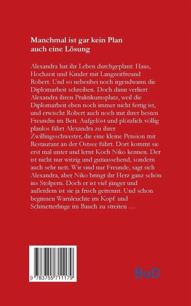 Manchmal ist gar kein Plan auch eine LösungAlexandra hat ihr Leben durchgeplant: Haus, Hochzeit und Kinder mit Langzeitfreund Robert. Und so nebenbei noch irgendwann die Diplomarbeit schreiben. Doch dann verliert Alexandra ihren Praktikumsplatz, weil die Diplomarbeit eben noch immer nicht fertig ist, und erwischt Robert auch noch mit ihrer besten Freundin im Bett. Aufgelöst und plötzlich völlig planlos fährt Alexandra zu ihrer Zwillingsschwester, die eine kleine Pension mit Restaurant an der Ostsee führt. Dort kommt sie erst mal unter und lernt Koch Niko kennen. Der ist nicht nur witzig und gutaussehend, sondern auch sehr nett. Wir sind nur Freunde, sagt sich Alexandra, aber Niko bringt ihr Herz ganz schön ins Stolpern. Doch er ist viel jünger und außerdem ist sie ja frisch getrennt. Und schon beginnen Warnleuchte im Kopf und Schmetterlinge im Bauch zu streiten ...