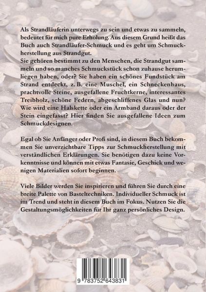 Strandläufer-SchmuckAls Strandläuferin unterwegs zu sein und etwas zu sammeln, bedeutet für mich pure Erholung. Aus diesem Grund heißt das Buch auch Strandläufer-Schmuck und es geht um Schmuckherstellung aus Strandgut. Sie gehören bestimmt zu den Menschen, die Strandgut sammeln und so manches Schmuckstück schon zuhause herumliegen haben, oder? Sie haben ein schönes Fundstück am Strand entdeckt, z. B. eine Muschel, ein Schneckenhaus, prachtvolle Steine, ausgefallene Fruchtkerne, ein interessantes Treibholz, schöne Federn, abgeschliffenes Glas und nun? Wie wird eine Halskette oder ein Armband daraus oder der Stein eingefasst? Hier finden Sie ausgefallene Ideen zum Schmuckdesignen. Über Jahre hinweg hat Mima Hohmann Schmuck aus den unterschiedlichsten Naturmaterialien entworfen. Egal ob Sie Anfänger oder Profi sind, in diesem Buch bekommen Sie unverzichtbare Tipps zur Schmuckherstellung mit verständlichen Erklärungen. Sie benötigen dazu keine Vorkenntnisse und können mit etwas Fantasie, Geschick und wenigen Materialien sofort beginnen. Es wird Ihnen Schritt für Schritt erklärt, wie Sie Ihren individuellen Schmuck selbst gestalten können, unterstützt durch kleine Videos zum besseren Verständnis. Viele Bilder werden Sie inspirieren und führen Sie durch eine breite Palette von Basteltechniken. Nutzen Sie die Gestaltungsmöglichkeiten für Ihr ganz persönliches Design. Von der einfachen über die ungewöhnliche, ausgefallene oder erlesene Halskette, geht es über Armreifen bis hin zu Ohrringen. Über die Auswahl des richtigen Bastelmaterials und der zur richtigen Verarbeitung Ihrer Schmuckstücke finden Sie in diesem Buch praktische Hinweise und gelingsichere, verständliche Anleitungen. Sie lernen Wissenswertes über die verschiedenen Muscheln und Schneckenhäuser und wo man sie finden könnte und bekommen historische Hintergründe über diese. Sie lernen, Ihre Muscheln und Schneckenhäuser zu durchbohren, zu umwickeln oder mit einer speziellen Methode ohne Kleber den Haken in den Gehäusen zu installieren. Sie können nach der Lektüre des Buches aus Federn Halsketten anfertigen und Steine als Schmuckstücke verwenden. Der Fruchtkern wird an Ihrem Hals als ausgefallene Kette jedem auffallen und so mancher wird Sie darum beneiden. Sie werden in das Vergolden und Versilbern von Strandgut eingeführt, mit Hinweisen auf die verschiedenen Gold- und Silberfarben. die man verwenden kann. Ich hoffe, ich kann mit einer guten Ideenprise Ihre Experimentierlust anregen!