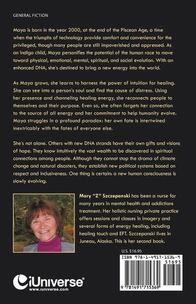 Maya is born in the year 2000, at the end of the Piscean Age, a time when the triumphs of technology provide comfort and convenience for the privileged, though many people are still impoverished and oppressed. As an Indigo child, Maya personifies the potential of the human race to move toward physical, emotional, mental, spiritual, and social evolution. With an enhanced DNA, she's destined to bring a new energy into the world. As Maya grows, she learns to harness the power of intuition for healing. She can see into a person's soul and find the cause of distress. Using her presence and channeling healing energy, she reconnects people to themselves and their purpose. Even so, she often forgets her connection to the source of all energy and her commitment to help humanity evolve. Maya struggles in a profound paradox: her own fate is intertwined inextricably with the fates of everyone else. She's not alone. Others with new DNA strands have their own gifts and visions of hope. They know intuitively the vast wealth to be discovered in spiritual connections among people. Although they cannot stop the drama of climate change and natural disasters, they establish new political systems based on respect and inclusiveness. One thing is certain: a new human consciousness is slowly evolving.