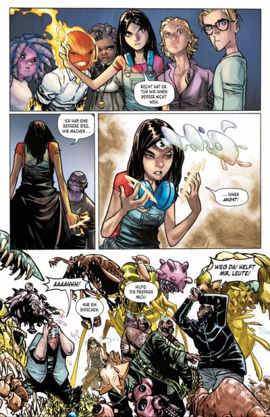 MAGISCHER ALLESKÖNNER Der 1978 geborene Skottie Young begann seine Karriere nach dem Jahrtausendwechsel mit Geschichten über die Fackel, die New X-Men, Venom, die New Warriors und die Mangaverse-Versionen der Marvel-Ikonen. Die Bestseller-Adaptionen der Oz-Romane um DER ZAUBERER VON OZ nach L. Frank Baum, die Young ab 2009 mit Autor Eric Shanower inszenierte, erhielten viel Aufmerksamkeit und sogar einen Eisner Award, also einen Comic- Oscar. Während der Amerikaner als Autor und Zeichner anschließend eine energiegeladene ROCKET RACCOONSerie sowie seine unabhängige Märchenland-Fantasy- Satire I Hate Fairyland umsetzte, verfasste Young noch DEADPOOL, Bully Wars und Middlewest. Und natürlich lieben Fans seine Baby-Versionen der Marvel-Stars, die er auf Variant-Covern und in eigenen Comics entfesselt. ZAUBERHAFTER ZEICHNER Humberto Ramos wurde Mitte der 1990er mit dem Flash- Serienableger Impulse zum Fanliebling. Die Verschmelzung von westlichen und östlichen Stilelementen lässt Ramos' Artwork seit Langem hervorstechen. 1998 gehörte der Mexikaner zu den Mitbegründern des Cliffhanger-Ablegers beim berühmten Image-Verlag unter Jim Lee, wo Ramos die eigenständigen Dark Fantasy-Serien CRIMSON und OUT THERE realisierte. Ab 2001 zeichnete der 1970 geborene Ramos für Marvel viele große Geschichten mit Spider-Man, die von Top-Autoren wie Paul Jenkins, Dan Slott oder Nick Spencer geschrieben wurden - nur wenige Künstler prägten 20 Jahre lang die Abenteuer des Netzschwingers. Zudem illustrierte Ramos WOLVERINE von Marc Guggenheim, X-MEN von Jeff Lemire, Runaways von Terry Moore, Champions von Mark Waid sowie Offenbarungen und Fairy Quest von Jenkins.