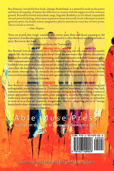 Strange Borderlands, Ben Berman's first full-length collection, counterpoises insights with uncertainties while chronicling the poet's immersion in a new culture. In compelling metrical, free verse and prose poems, Berman provides a vivid narrative of exotic adventures, especially his Peace Corps service in Zimbabwe-the people, the land, and his "struggling with the blurred lines of where things end" on his return home. This distinctive collection can go from humorous to heartbreaking, and is spellbinding from start to finish-a rare achievement. PRAISE FOR STRANGE BORDERLANDS: Ben Berman’s wonderful first book, Strange Borderlands, is a masterful study in the power and limits of empathy, of respect for difference in tension with the urgent need for common ground. Beyond his formal and stylistic range, linguistic flexibility, eye for detail, irrepressible wit and powerful feeling, what’s most impressive about this terrific book is Berman’s inclusive generous spirit, the deadly serious imaginative play he exercises in every line of every poem. This is a book to cherish. —Alan Shapiro These are poems that weigh, consider, and restore some flesh-and-blood meaning to the experience of multiculturalism, a word so overused it is often flattened out to a platitude or piety. But not in this book. —Fred Marchant (from the “Foreword”) Ben Berman’s lyric poems set in Zimbabwe dig deep into the casual and the casualty of daily life: the hammer striking the sheep’s head, the sustenance that follows; disciplinary beatings that students, giggly and protesting, could count and count on to fade. Unassuming but wise, compassionate yet wildly, unpredictably funny at times, Berman delivers to us escalating hardships that somehow elevated us toward the sacred; the pathetic harvest and sweetness that comes from the least likely of places. This least likely of places is where Berman thrives, calling on closely observed facts to chronicle the perimeters of tenderness and cruelty. I believe every word in this collection. This is an unforgettable debut by a powerful and humble voice. —Dzvinia Orlowsky Ben Berman’s marvelous first book, Strange Borderlands, chronicles in startling and unforgettable poems his sojourn in Zimbabwe and his immersion in a culture that both embraces and exiles him, attracts and reproaches, changing him forever. Using a variety of poetic approaches—rhymed couplets, prose paragraphs, sonnets, free verse—he gives us a multi-tonal description of landscapes that are as elusive as they are inviting, as unfamiliar to most of us as they are intuitively recognizable. This is a compelling poetry of “strange borderlands where distance and intimacy collide.” —Gregory Djanikian ABOUT THE AUTHOR: Ben Berman grew up in Maine, served in the Peace Corps in Zimbabwe and currently lives in the Boston area with his wife and daught