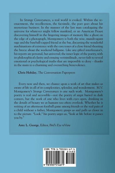 In Strange Conveyances, a real world is evoked. Within the re-enactment, the recollection, the facsimile, the poet goes about his mysterious business. In the manner of the last man cataloguing the universe for whatever might follow mankind, or an American Proust discovering himself in the lingering images of memory like a ghost on the edge of a photograph, Montgomery is both the wise, mundivagant sage and the baseball-capped friend at the bar, discussing the wonderful machinations of existence with the easy tones of a close friend shooting the breeze about the weekend ballgame. Like any gifted interlocutor's, his reports are personal, but universal; the inner logic of the poetry, with its philosophical clarity and ensuing verisimilitude, never fails to reveal emotional or psychological truths that are impossible to deny - thanks in the main to a charming and overarching benevolence. Chris Hobday, The Conversation Paperpress Every now and then, we chance upon a work of art that makes us aware of life in all of its complexities, splendor, and wonderment. M.V. Montgomery's Strange Conveyances is one such work. Montgomery's poetry is real and accessible-not the poetry of angst buried in dark corners, but the work of one who lives with eyes open, drinking in the details of beauty we as humans too often overlook. Whether he is writing of an afternoon football game among friends or the real pain of a child without a father, Montgomery grasps us and pulls us closer in to the picture. "Look," his poetry urges us, "look at life before it passes you by." Amy L. George, Editor, Bird's Eye reView