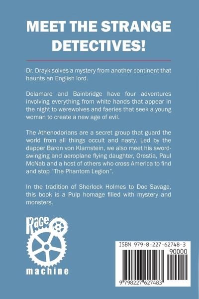 Meet the strange detectives! Dr. Drayk solves a mystery from another continent that haunts an English lord. Delamare and Bainbridge have four adventures involving everything from white hands that appear in the night to werewolves and faeries that seek a young woman to create a new age of evil. The Athenodorians are a secret group that guard the world from all things occult and nasty. Led by the dapper Baron von Klarnstein, we also meet his sword-swinging and aeroplane flying daughter, Orestia, Paul McNab and a host of others who cross America to find and stop "The Phantom Legion". In the tradition of Sherlock Holmes to Doc Savage, this book is a Pulp homage filled with mystery and monsters.