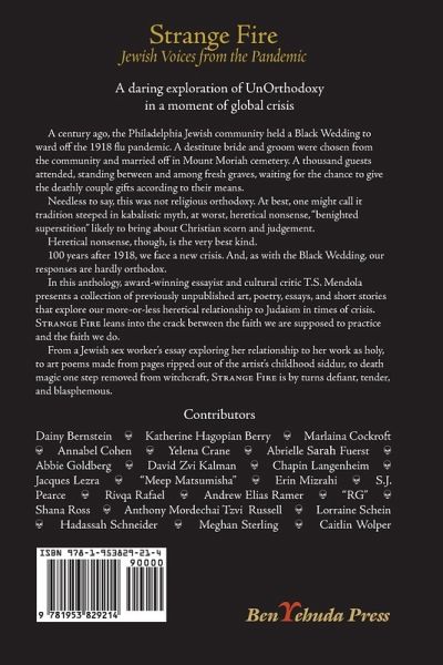 A daring exploration of UnOrthodoxy in a moment of global crisis A century ago, the Philadelphia Jewish community held a Black Wedding to ward off the 1918 flu pandemic. A destitute bride and groom were chosen from the community and married off in Mount Moriah cemetery. A thousand guests attended, standing between and among fresh graves, waiting for the chance to give the deathly couple gifts according to their means. Needless to say, this was not religious orthodoxy. At best, one might call it tradition steeped in kabalistic myth, at worst, heretical nonsense, "benighted superstition" likely to bring about Christian scorn and judgement. Heretical nonsense, though, is the very best kind. 100 years after 1918, we face a new crisis. And, as with the Black Wedding, our responses are hardly orthodox. In this anthology, award-winning essayist and cultural critic T.S. Mendola presents a collection of previously unpublished art, poetry, essays, and short stories that explore our more-or-less heretical relationship to Judaism in times of crisis. Strange Fire: Jewish Voices from the Pandemic leans into the crack between the faith we are supposed to practice and the faith we do. From a Jewish sex worker's essay exploring her relationship to her work as holy, to art poems made from pages ripped out of the artist's childhood siddur, to death magic one step removed from witchcraft, Strange Fire is by turns defiant, tender, and blasphemous.