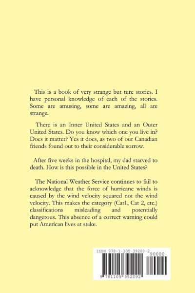 This is a book of strange, true stories. I have personal knowledge of all the stories. Some are amusing, some are amazing, all are strange. You will find out about the Inner and the Outer United States and why the difference is important. Find out why you are at unnessary risk from hurricanes. Could there be a Bigfoot in New Mexico. It's not a good idea to mess with Senior Citizens. Practice doesn't make perfect. Find out why. Cornerbacks can't see quarterbacks eyes and what they are really looking at. To some people's surprise, New Mexico is not a part of Mexico but is actually a part of the United States. Fishing with dynamite, that's a no-no. How about a meadowlark steak or a nice bowl of meadlark soup?