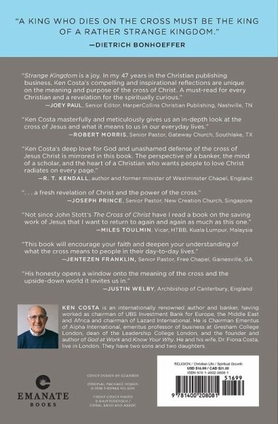 Experience how the power of the cross unleashes meaning and purpose in the midst of your daily life. This meditative and spiritual reflection by Ken Costa considers the cross and the king who died upon it. Christ's work on the cross established a kingdom that is strange indeed, if a king died on the cross in order to establish it. It is a kingdom where suffering and abandonment are transformed into the power of presence and live, a kingdom where a King exchanges gifts of great value for worthless dross, where a robber becomes righteous, and a criminal becomes the first citizen of heaven. Spend some time as Easter draws near considering the strange, upside-down kingdom, where broken things are made whole. "A king who dies on the cross must be the king of a rather strange kingdom." --Dietrich Bonhoeffer "Strange Kingdom is a joy. In my 47 years in the Christian publishing business, Ken Costa's compelling and inspirational reflections are unique on the meaning and purpose of the cross of Christ. A must-read for every Christian and a revelation for the spiritually curious."--Joey Paul, Senior Editor, HarperCollins Christian Publishing, Nashville, TN "Ken Costa's deep love for God and unashamed defense of the cross of Jesus Christ is mirrored in this book. The perspective of a banker, the mind of a scholar, and the heart of a Christian who wants people to love Christ radiates on every page." --R. T. Kendall, author and former minister of Westminster Chapel, England ". . . a fresh revelation of Christ and the power of the cross."--Joseph Prince, Senior Pastor, New Creation Church, Singapore "Not since John Stott's The Cross of Christ have I read a book on the saving work of Jesus that I want to return to again and again as much as this one." --Miles Toulmin, Vicar, HTBB, Kuala Lumpur, Malaysia "This book will encourage your faith and deepen your understanding of what the cross means to people in their day-to-day lives." --Jentezen Franklin, Senior Pastor, Free Chapel, Gainesville, GA "His honesty opens a window onto the meaning of the cross and the upside-down world it invites us in." --Justin Welby, Archbishop of Canterbury, England