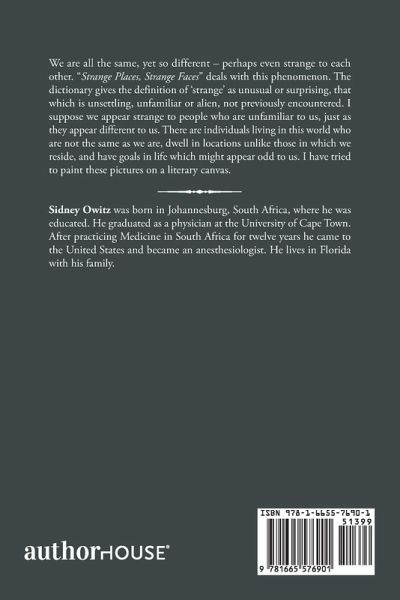 We are all the same, yet so different - perhaps even strange to each other. "Strange Places, Strange Faces" deals with this phenomenon. The dictionary gives the definition of 'strange' as unusual or surprising, that which is unsettling, unfamiliar or alien, not previously encountered. I suppose we appear strange to people who are unfamiliar to us, just as they appear different to us. There are individuals living in this world who are not the same as we are, dwell in locations unlike those in which we reside, and have goals in life which might appear odd to us. I have tried to paint these pictures on a literary canvas.