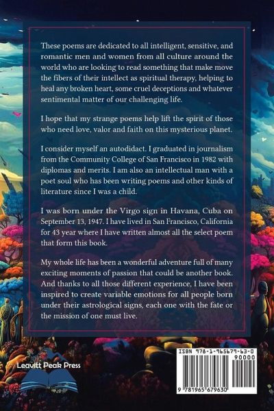 These poems are dedicated to all intelligent, sensitive, and romantic men and women from all culture around the world who are looking to read something that make move the fibers of their intellect as spiritual therapy, helping to heal any broken heart, some cruel deceptions and whatever sentimental matter of our challenging life. I hope that my strange poems help lift the spirit of those who need love, valor and faith on this mysterious planet. I consider myself an autodidact. I graduated in journalism from the Community College of San Francisco in 1982 with diplomas and merits. I am also an intellectual man with a poet soul who gas been writing poems and other kinds of literature since I was a child. I was born under the Virgo sign in Havana, Cuba on September 13, 1947. I have lived in San Francisco, California for 43 year where I have written almost all the select poem that form this book. My whole life has been a wonderful adventure full of many exciting moments of passion that could be another book. And thanks to all those different experience, I have been inspired to create variable emotions for all people born under their astrological signs, each one with the fate or the mission of one must live.
