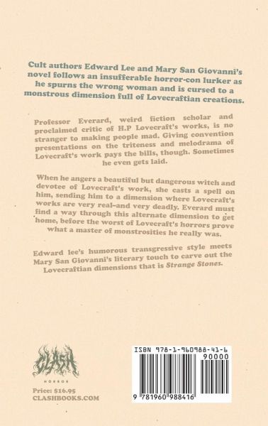 Cult authors Edward Lee and Mary SanGiovanni's novel follows an insufferable horror-con lurker as he spurns the wrong woman and is cursed to a monstrous dimension full of Lovecraftian creations. Professor Everard, weird fiction scholar and proclaimed critic of H.P Lovecraft's works, is no stranger to making people mad. Giving convention presentations on the triteness and melodrama of Lovecraft's work pays the bills, though. Sometimes he even gets laid. When he angers a beautiful but dangerous witch and devotee of Lovecraft's work, she casts a spell on him, sending him to a dimension where Lovecraft's works are very real-and very deadly. Everard must find a way through this alternate dimension to get home, before the worst of Lovecraft's horrors prove what a master of monstrosities he really was. Edward lee’s humorous transgressive style meets Mary SanGiovanni’s literary touch to carve out the Lovecraftian dimensions that is Strange Stones.