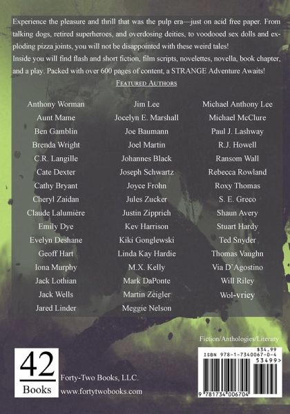 Forty-eight authors from around the world have come together and wrestled their works into submission that were sitting around in old files being fat and lazy, getting dusty in typewriters, and hiding in their notebooks! There is everything from the unusual, surprising, unsettling, the bizarre, unexplained, to the unanswered, wonderment, horrific, moral breaking and ethics defying. In this volume, the reader will find flash and short fiction, film scripts, novelettes, a play, book chapter, and a novella. From tales of deities overdosing, forced castration, and penny fiction, to the strange occurrences of dimensional superheroes, exploding pizza joints, and alien cults, enter a world of fiction which will knock your pants off… literally! If you don’t like to have your pants knocked off, then good, more for us! (You can slink back to reading Jane Austen and The Notebook). Fresh and new, fall into the strange, surrender to the temptation of the weird, and read stories by authors from around world! Packed with over 600 pages of content, a STRANGE Adventure Awaits! Featured Authors: Aunt Mame, Cate Dexter, Joyce Frohn, M.X. Kelly, R.J. Howell, Anthony Worman, Shaun Avery, Claude Lalumière, Evelyn Deshane, Daniel Cureton, Jared Linder, Joe Baumann, Kev Harrison, Meggie Nelson, Paul Lashway, Thomas Vaughn, Cathy Bryant, C.R. Langille, Jim Lee, Jules Zucker, Roxy Thomas, Michael Anthony Lee, Joseph Schwartz, Via D'Agostino, Ben Gamblin, Geoff Hart, Jack Lothian, Joel Martin, Kiki Gonglewski, Mark DaPonte, Ransom Wall, Stuart Hardy, Will Riley, Jack Wells, Viviana Ramirez, Linda Kay Hardie, Ted Snyder, Emily Dye, Iona Murphy, Martin Zeigler, Johannes Black, Brenda Wright, Cheryl Zaidan, Jocelyn Marshall, Justin Zipprich, Michael McClure, Rebecca Rowland, S. E. Greco, Wol-vriey.