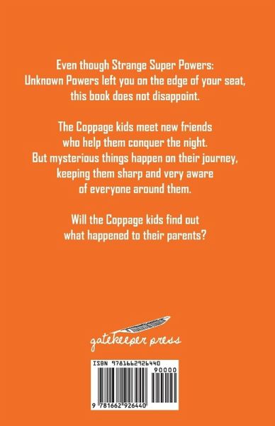 Strange Super Powers: Unknown Powers ended on a cliffhanger ending, and this book continues the storyline. The Coppage Kids meet new friends who help them conquer the terrors of the night, but mysterious things happen on their journey. Will the Coppage Kids finally find out what happen to their parents?