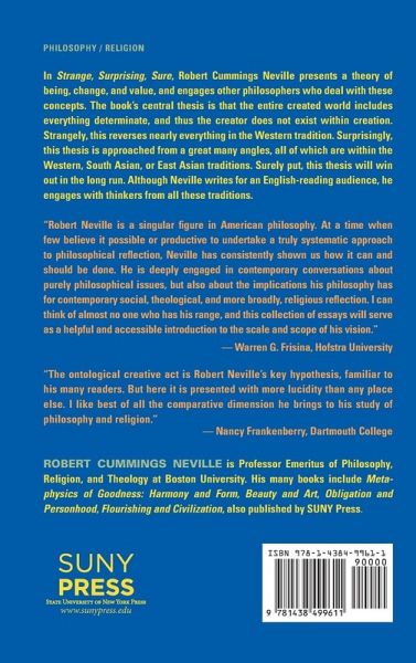 In Strange, Surprising, Sure, Robert Cummings Neville presents a theory of being, change, and value, and engages other philosophers who deal with these concepts. The book's central thesis is that the entire created world includes everything determinate, and thus the creator does not exist within creation. Strangely, this reverses nearly everything in the Western tradition. Surprisingly, this thesis is approached from a great many angles, all of which are within the Western, South Asian, or East Asian traditions. Surely put, this thesis will win out in the long run. Although Neville writes for an English-reading audience, he engages with thinkers from all these traditions."