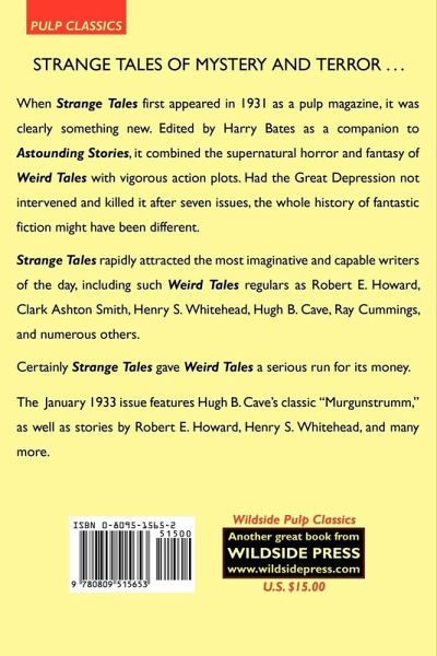 When Strange Tales first appeared, it was clearly something new. Edited by Harry Bates, it combined the supernatural horror and fantasy of Weird Tales with vigorous action plots. Strange Tales rapidly attracted the most imaginative and capable writers of the day, including Robert E. Howard, Clark Ashton Smith, Henry S. Whitehead, Hugh B. Cave, Ray Cummings, and numerous others. Had the Great Depression not intervened and killed it after seven issues, the whole history of fantastic fiction might have been different. This issue issue features Hugh B. Cave's classic "Murgunstrumm," as well as stories by Robert E. Howard, Henry S. Whitehead, and many more.
